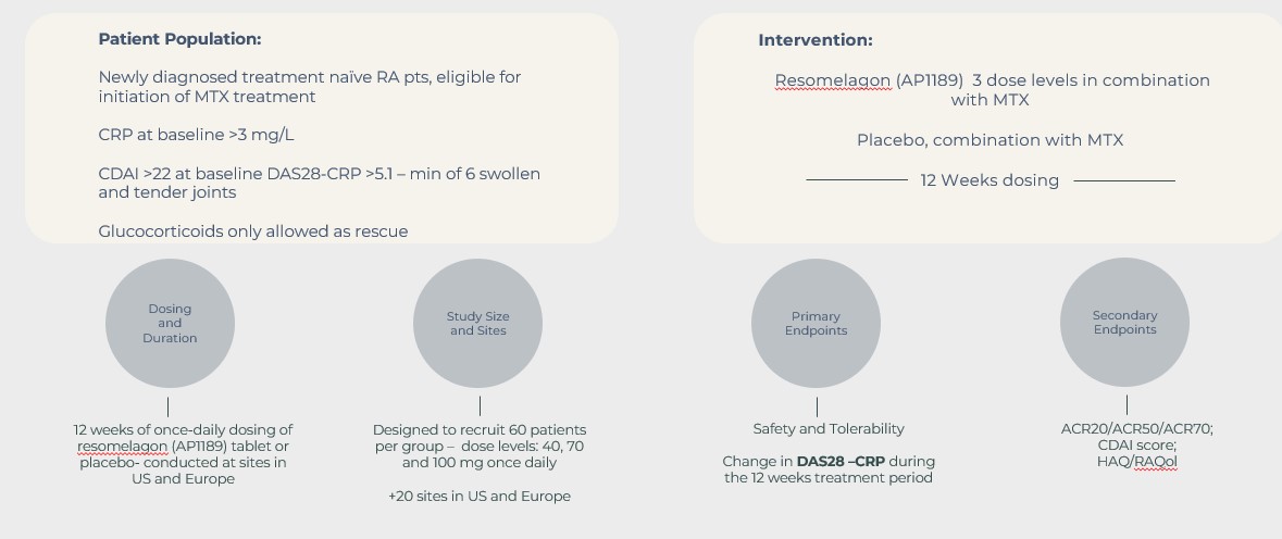 The aim is to recruit a total of 240 patients with a reduction in DAS28- CRP as the primary efficacy readout and will be conducted as an international study under the current US-IND (FDA) for development of resomelagon (AP1189) in RA.
